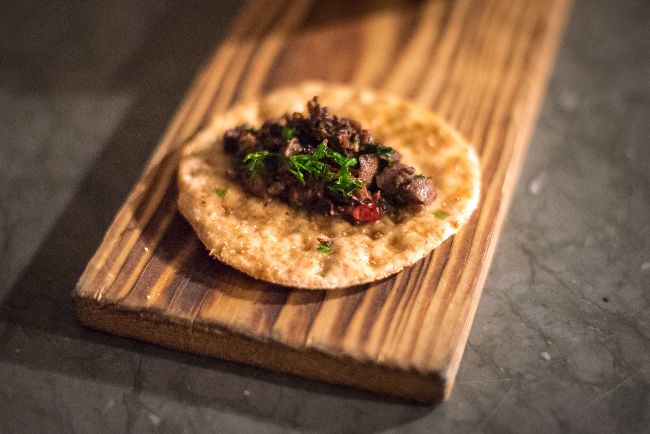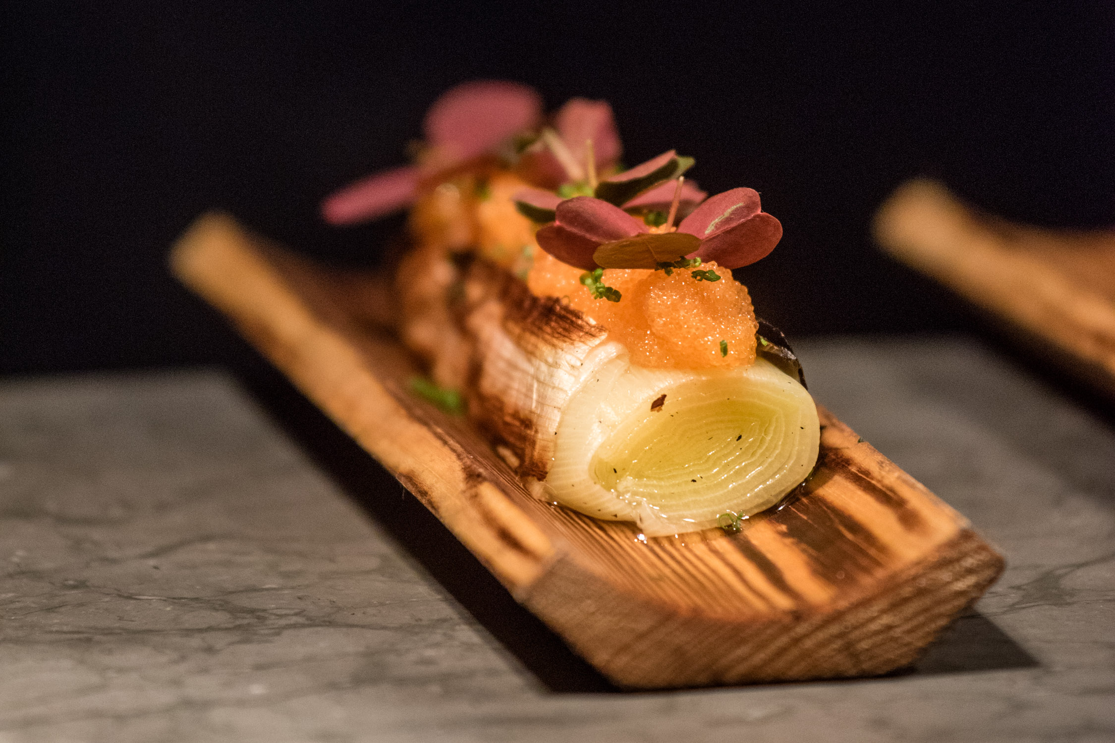 The space we found ourselves in was warm and cozy. It had a laid-back feeling thanks to the tasteful design which incorporated everything from wooden tables and cabinets, to exposed metal pipework. It’s the type of space you can spend a long time in, catching up with friends and enjoying an incredible meal. We sat at the long bar in front of the kitchen, and this gave us a front row seat for the show, which is Ekstadt’s chefs preparing the food. We saw with our own eyes how they took the meat from the campfire like pit, and then transformed it into a visual work of art, with the precision of surgeons.