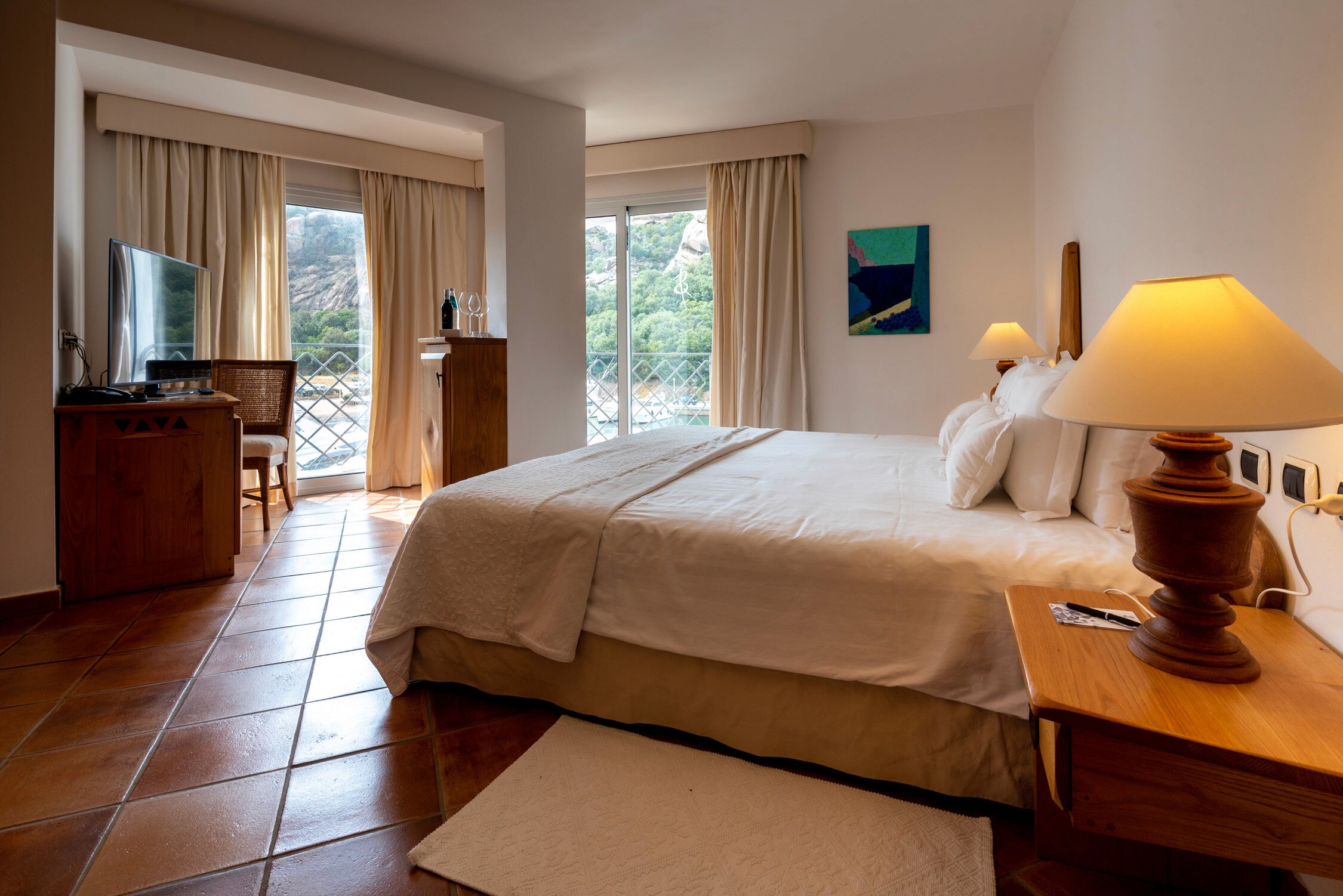 The Grand Hotel Poltu Quatu offers a variety of different rooms, suites and apartments, each with their own unique view and amenities. The rooms could use a bit of a face lift, but you’ll still get that laid back beach vibe in a beautiful location. They feature neutral beach tone furniture, white bedding, terra cotta floors and pops of the Italian charm you’d expect to find here...like wine if your room :) If you’re traveling with your family or prefer more space, they offer 66 apartments on the property, as well. These suites come complete with a kitchen, dining room and living room, only made better by views of the emerald mountains and blue sea.