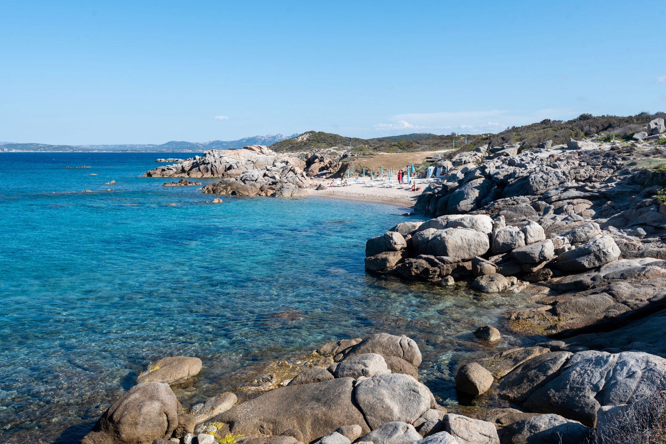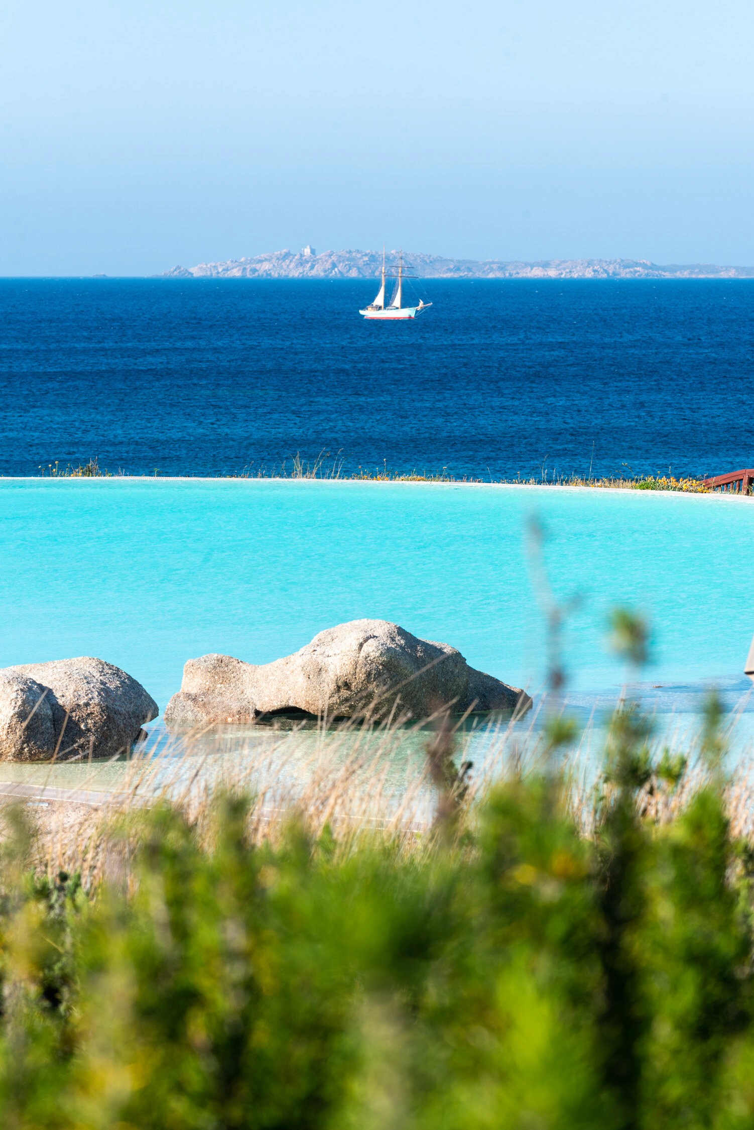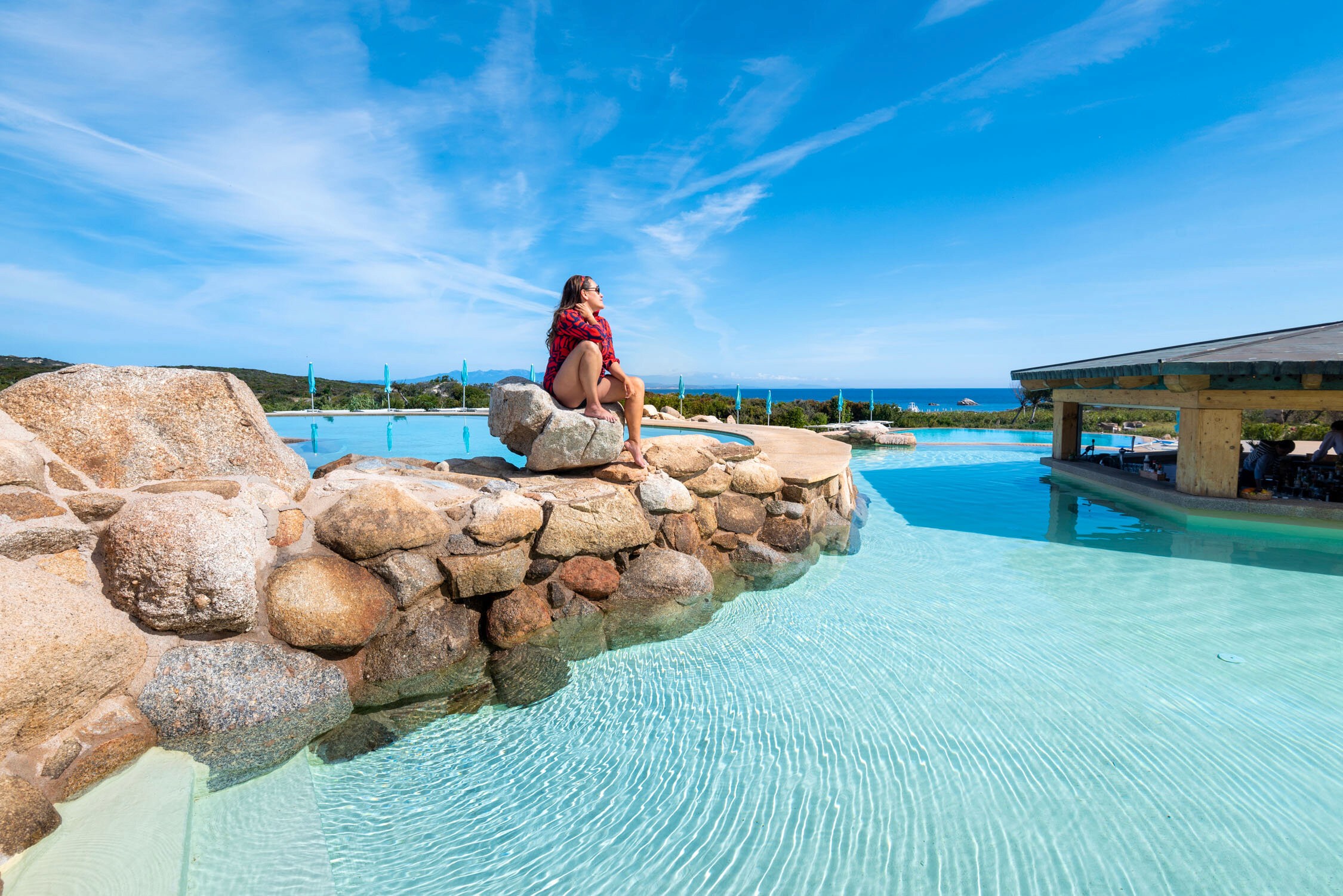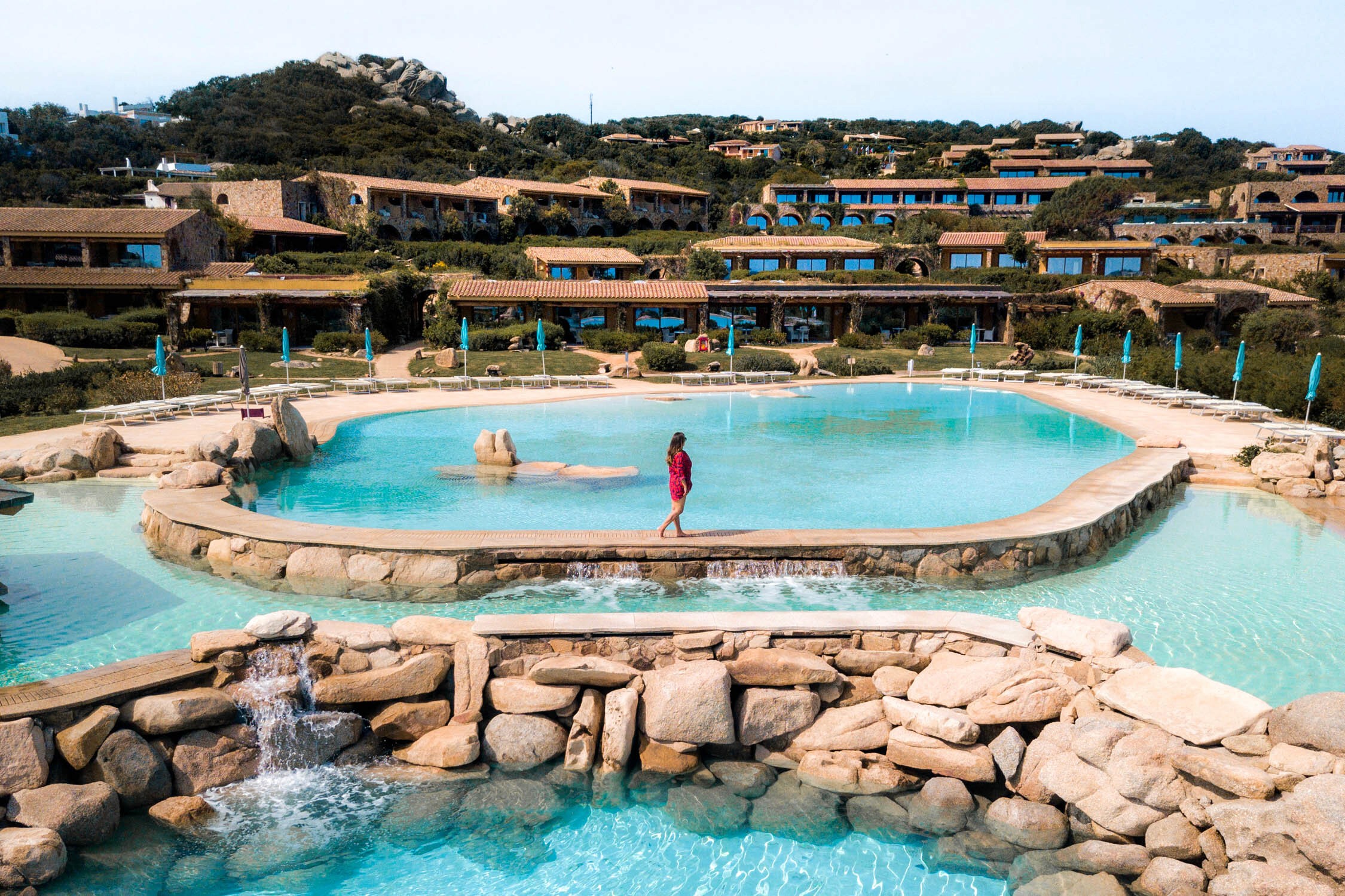 Sardinia is one of those stunning European destinations that makes it onto most bucket lists, and we were no exception. We had wanted to visit for so long! For those who don’t know much about Sardinia, let me explain… It’s a remote island off the coast of Italy, featuring everything from picturesque views of sprawling coastlines and limestone cliffs to some of the most beautiful beaches we have ever seen! As its right in the middle of the Mediterranean Sea, we expected a laid back vibe (similar to Greece) yet with all the Italian influence we love, and that is exactly what we got! Our hotel, Valle dell’Erica was located right on the water (about an hour from the airport) on sprawling, immaculate grounds. Its exterior resembled charming Italian villas, dotted with pristine turquoise infinity pools, lush grass and bays, and 360 degree views of the ocean.