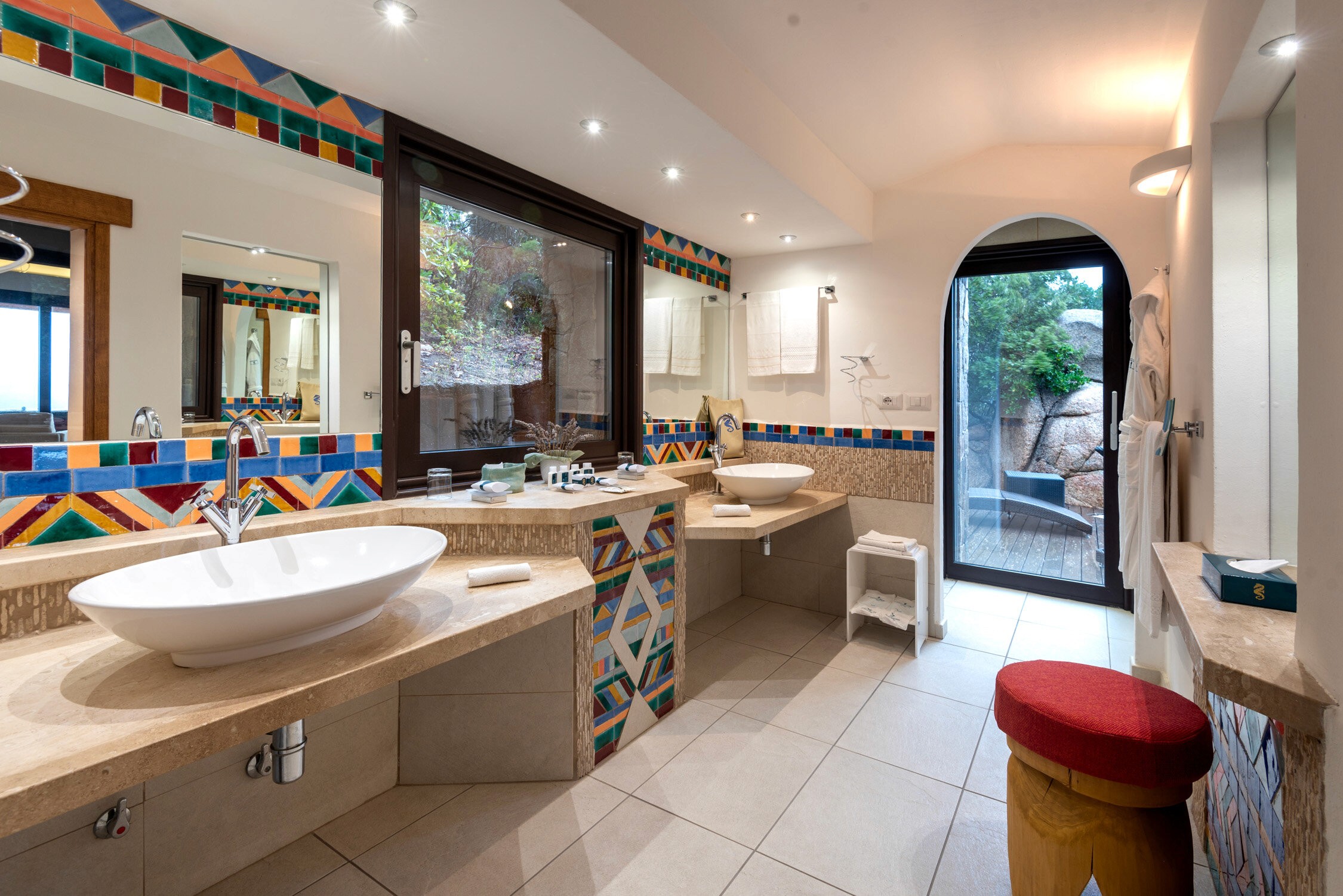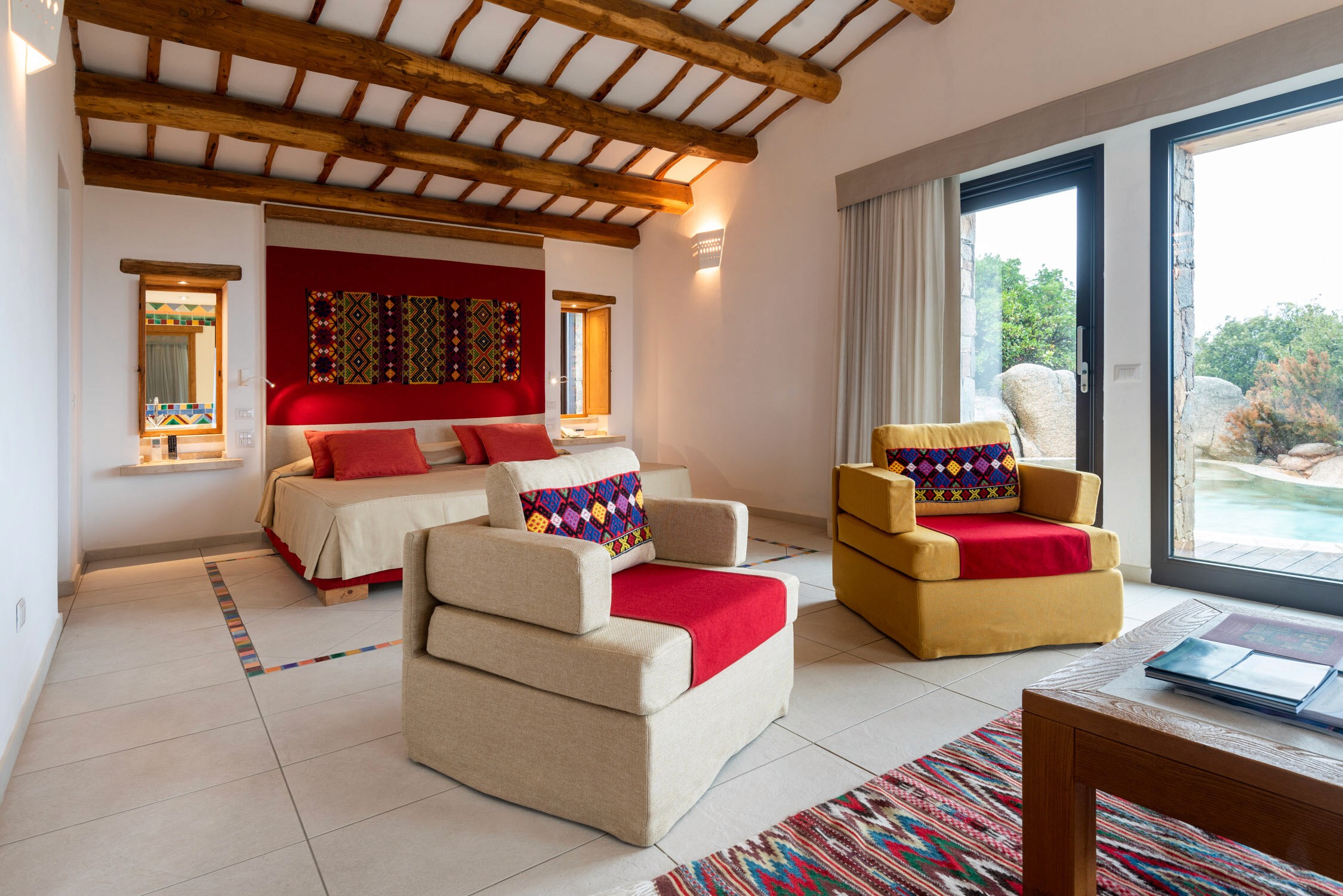 The hotel itself is stunning, surrounded by 1,400 meters of coastline and nestled in 28 hectares of a private park that’s rich with plants and wildlife. When you arrive, you know you’re in the wilderness, but have the beach at your doorstep- the best of both worlds. It’s open, bright and airy, with trails leading from one villa to the next, speckled by inlets of white sand beaches.The overall decor of Hotel Valle dell’Erica has a modern but coastal vibe, with subtle beachy tones and pops of color to draw your eye. White washed walls, natural earthy wood floors and classic and crisp white bedding are featured in the suites.