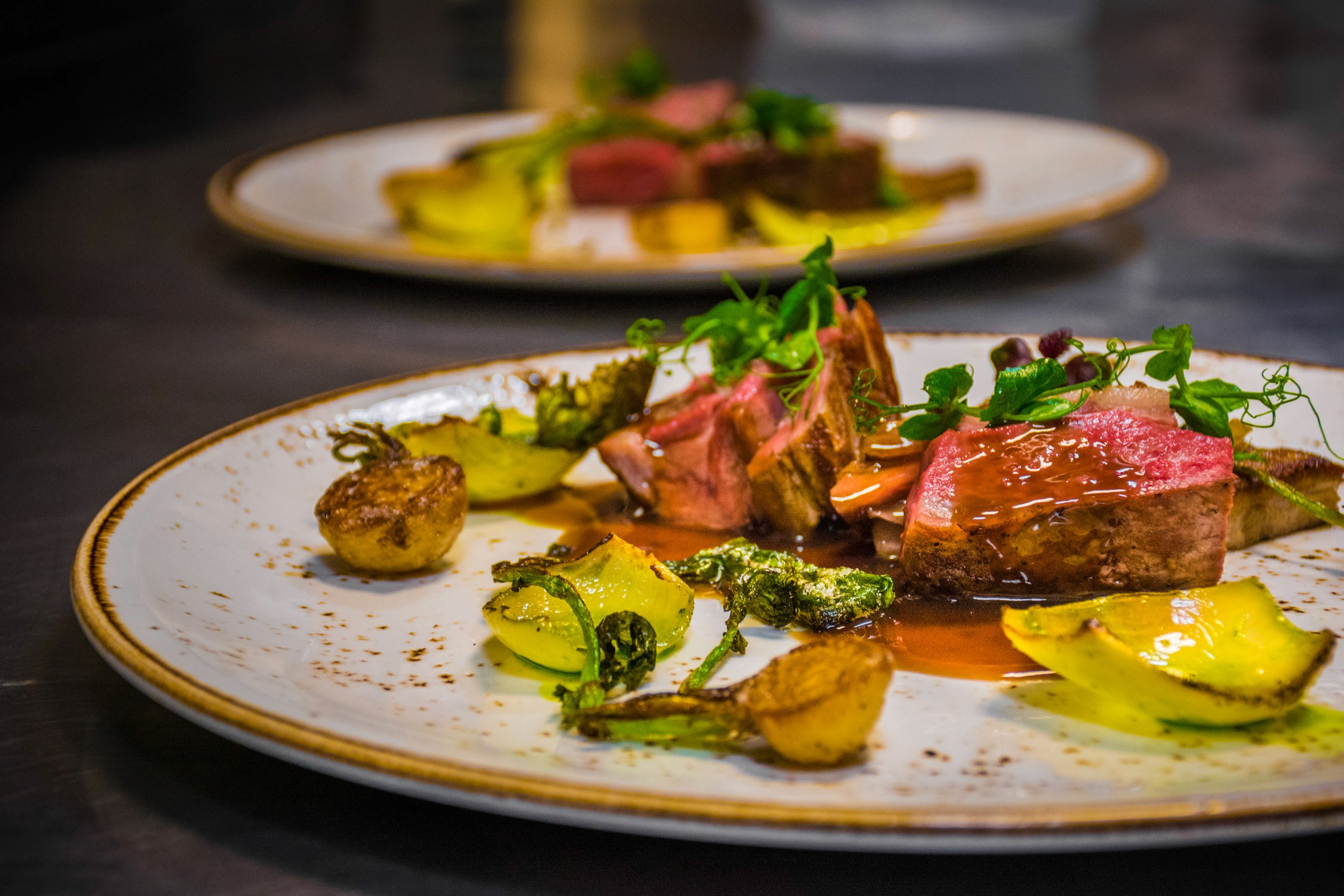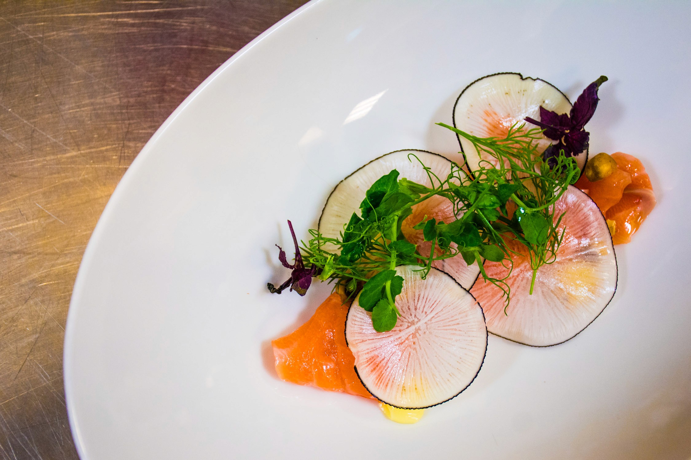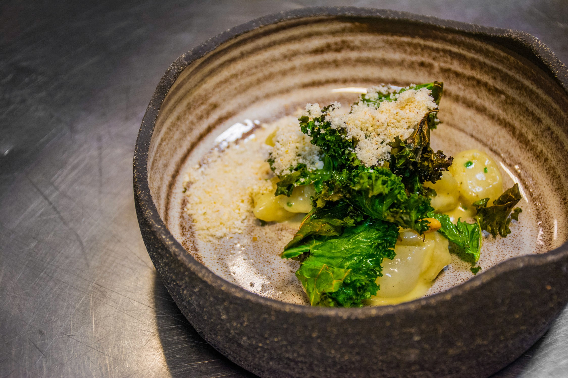 Our meal was served in traditional Italian style, beginning with a seafood dish of salmon crudo and black radish with hazelnut milk and parsley oil. The pasta course that followed was gnocchi and pecorino served with baked kale, pearl onions, and smoke pine nuts — a dish so good, that it rivaled anything we’d eaten in Italy.