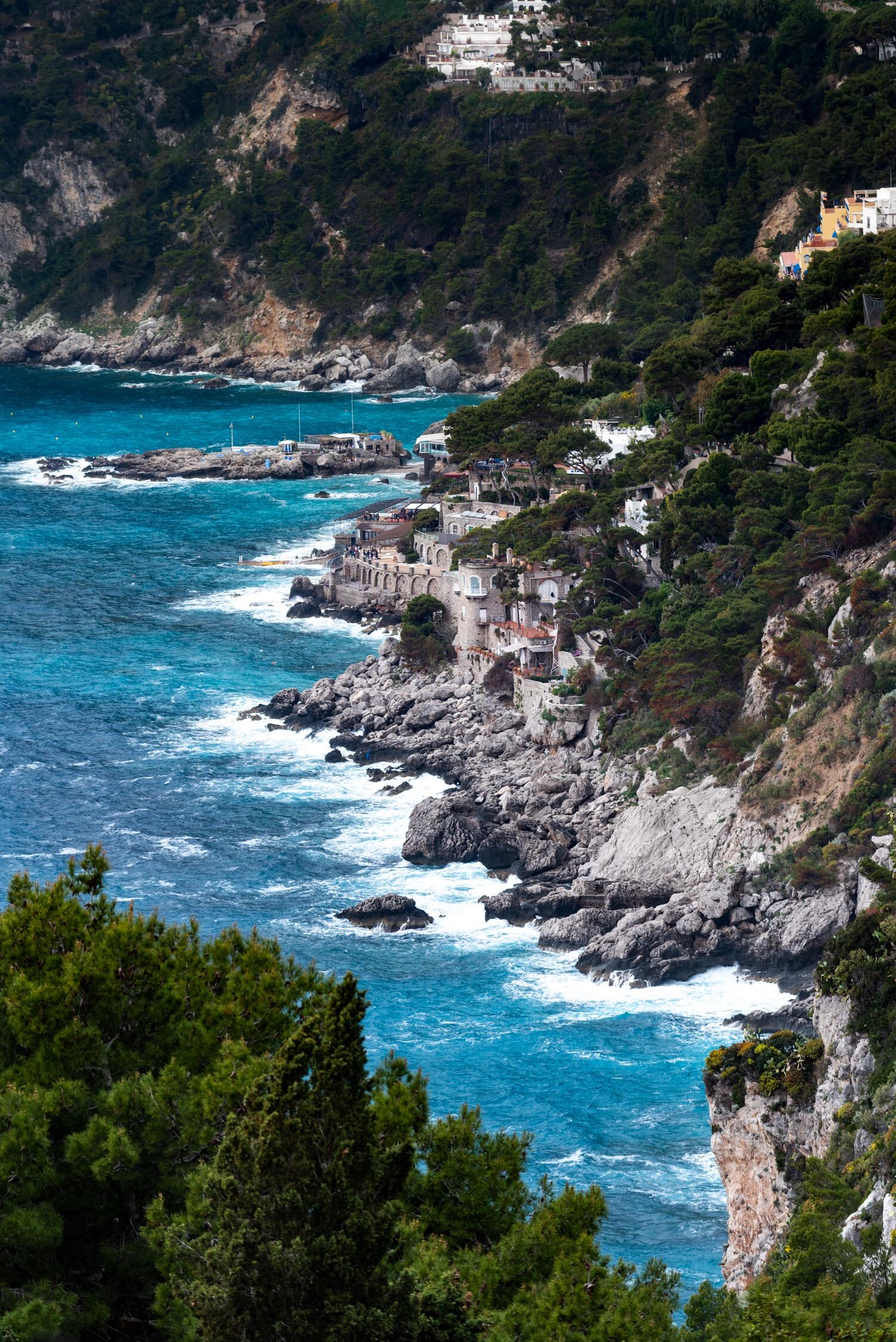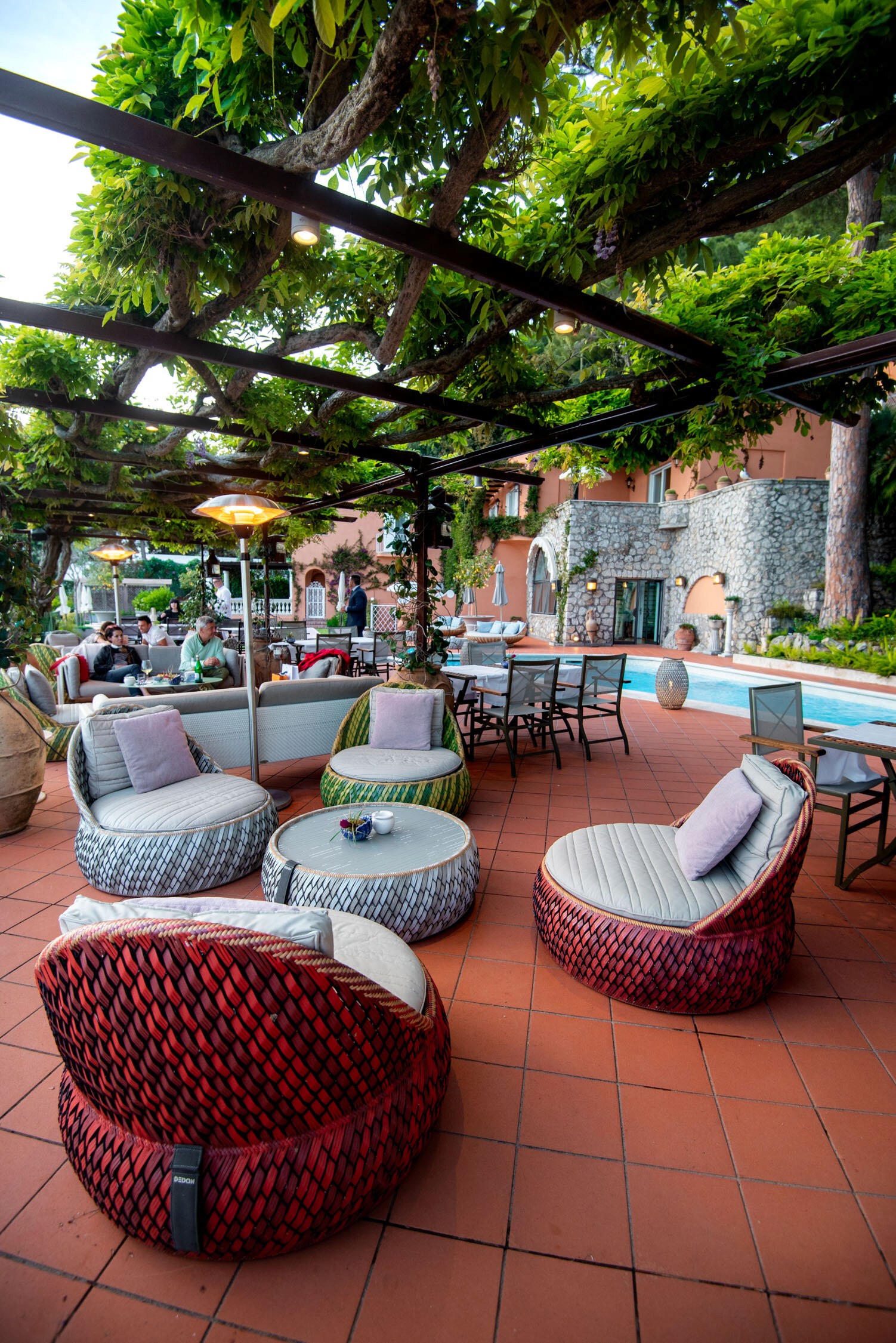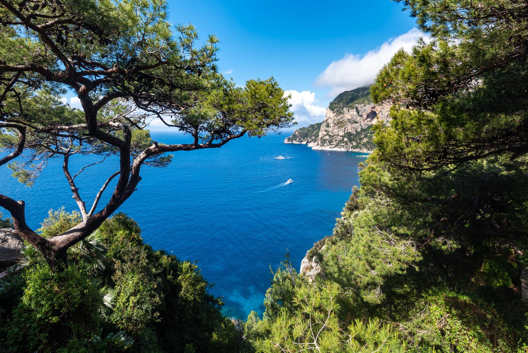Capri sits in the Gulf of Naples; so to get to it we took a ferry through the Tyrrhenian Sea. The 30 minute ferry ride was a great way to relax and sink into the holiday mode. At Capri’s port we were met by a porter from the hotel who picked up our bags and handed us tickets to the funicular. Capri is full of winding streets and narrow alleyway - not ideal if you have large suitcases, but the porters are pros at navigating through the crooked paths! The funicular dropped us off at Piazza Umberto, Capri’s central town square. The hotel was another 15 minute walk, but we weren't complaining - along the way we (ok only myself) window shopped at all the designer stores lining the streets, there was Hermes, Vuitton, Dior, Missoni and so much more, all sitting neatly next to each other and beautiful cafes with people sitting and sipping a spritz. Capri is definitely a vibe and we were there to check it out!