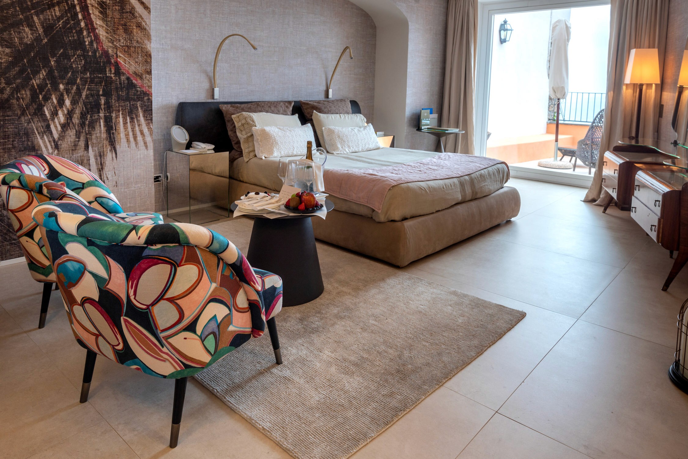 Hotel Punta Tragara was once the summer home to Count and Countess of Manfredi who, every summer, would invite their friends, family and even dignitaries to stay. It was a place for relaxation and rejuvenation; not just for the body but also for the mind and soul. Hotel Punta Tragara carries forward that vision and atmosphere of joy, bonhomie and peace even today. The hotel’s decor is elegant but quirky, with warm, earthy orange walls balancing out colorful abstract and floral prints that grace furniture, cushions and other accessories through the hotel. And, since the hotel is so strategically placed, the view of the sea and the horizon follow you everywhere you go and really is the masterpiece of the hotel.