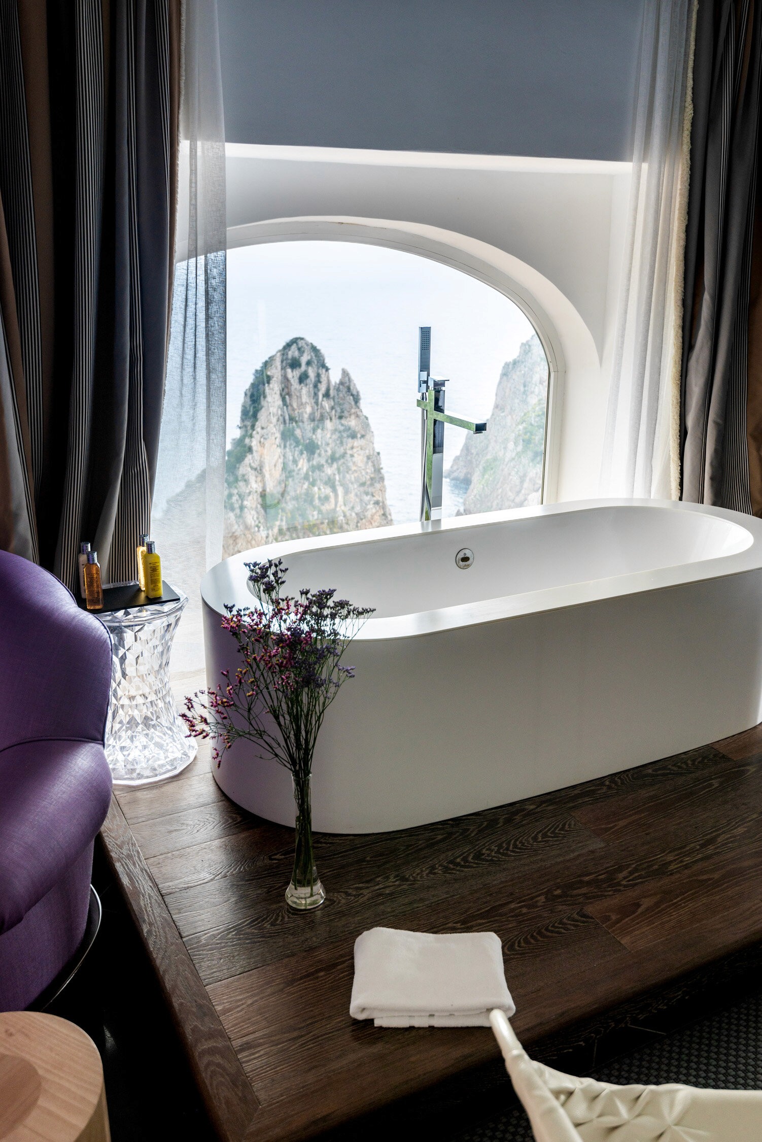 Our room featured glass paneled French doors opened out onto a terrace which overlooked the Marina Piccola bay. We were staying in a Junior suite, and as we stepped into the room, we were distracted from the view when we spotted a plate of fresh fruits and a bottle of champagne with a handwritten note welcoming us to Hotel Punta Tragara. We were so impressed by the gesture and it set the tone of luxury for the rest of our stay. Another stunning element in our room was the bathtub which sat majestically in the corner of the room...and I really do mean majestically. It was like a small pool, with jets right next to our bed. It was a little odd at first, but once we took that first bath, it totally made sense ;) There was plenty of space in the room, which was more like a small apartment sans the kitchen. We had a huge bathroom, walk-in closet, and lots of privacy so that Chris and I could enjoy that bottle of champagne together :)