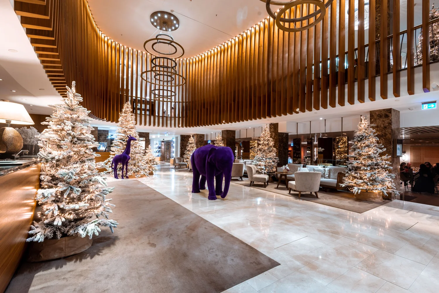 Charming, historic, festive and stunning are just a few of the adjectives that come to mind when describing the Ritz-Carlton Vienna. The property itself is housed inside one of the palatial 19th century palaces that line the historic Ring Boulevard, making it a very central location. Cobblestone streets give you the sense of traditional European charm, while the large bold letters of the Ritz, flanked by dangling icicle lights remind you that luxury awaits. As the Ritz Carlton is a luxury hotel brand, recognized around the world, you can always expect the design to be elegant with contemporary and modern touches throughout. But for the holidays, the design and decor goes into festive mode! When we walked into the lobby, bright lights and faux bright trees lined the interiors with velvety (almost life size) stuffed animals mingling throughout. It sounds a little kitschy, I know, but wow was it beautiful and elegant. It was like walking through a winter fairytale, just completely mesmerizing and totally captivating.