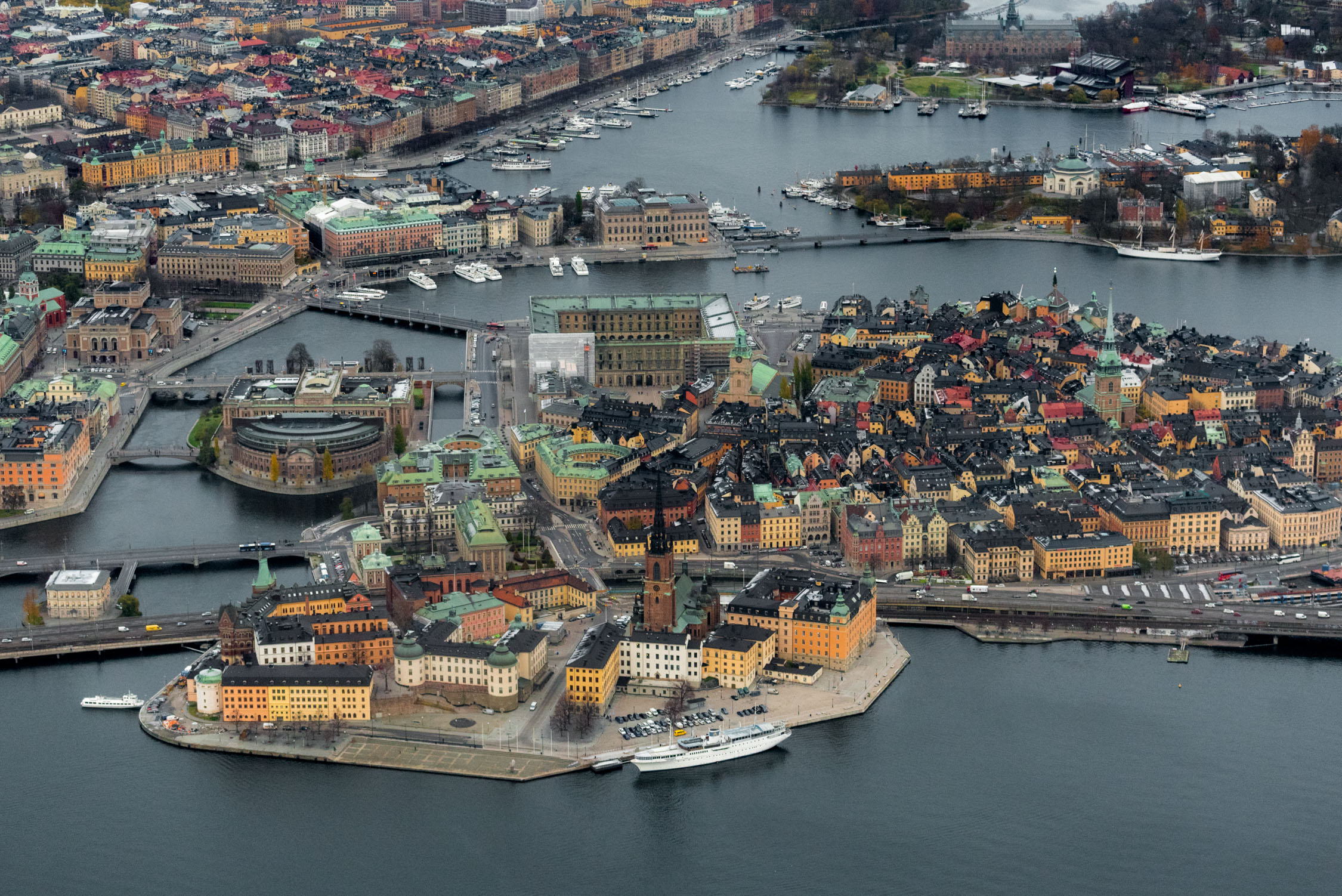This wasn't our first time in a helicopter -- but that didn't make it any less exciting! In fact, for us just getting up in a helicopter is fun experience, however once we were circling the city we were blown away by the views of the city as well as the novelty of our mode of transport. So many details jumped out at us which we would not have been able to see otherwise. We noticed how brightly colored the houses are, with their red and yellow facades contrasting with their slate black roofs. We knew that Stockholm had many islands (there are fourteen in the center to be precise), but seeing them from above helps you appreciate the elaborate waterway system even more. Venice and Amsterdam are famous for their canals, but Stockholm should get more recognition for its similar geography.