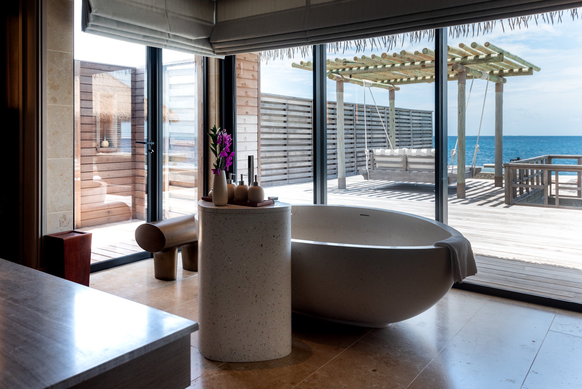 We stayed in a overwater villa with a private pool and spacious outdoor deck. Walking inside, the design was chic and had a sophisticated city vibe to it … just with the most beautiful water views instead of city lights! There was a large living room with a bar, a bedroom, a dressing area with enormous closets, a very big bathroom with double sinks, a huge bathtub with a view of the ocean and an outdoor rain shower. This villa was huge!