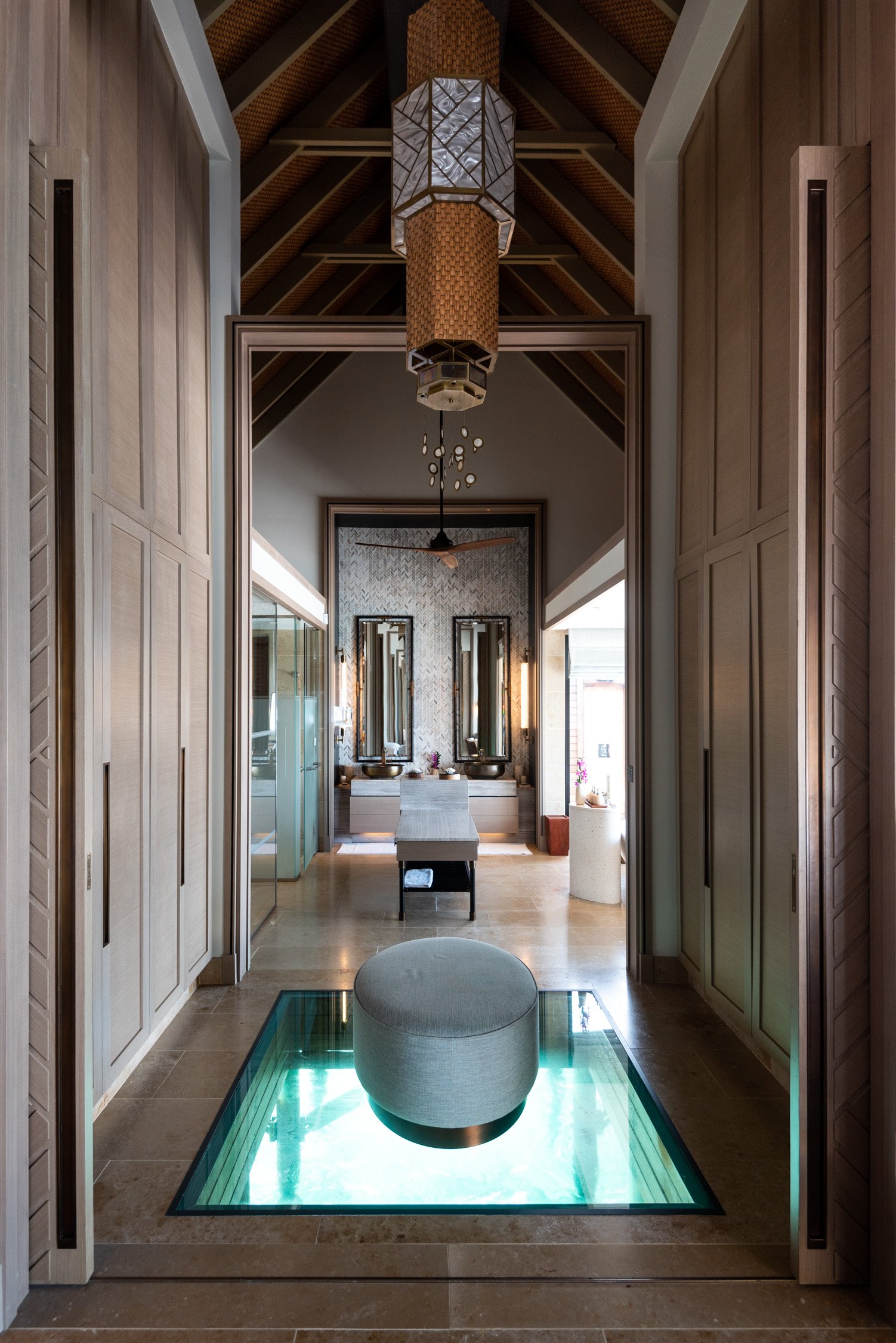 The layout of our villa was like a straight line, with floor to ceiling glass sliding doors running along one side looking out onto our deck and pool area and further onto the ocean. Our favourite feature was the dressing area, because the floor was made of glass, so we could look out at the fish and other water animals. It was special :)